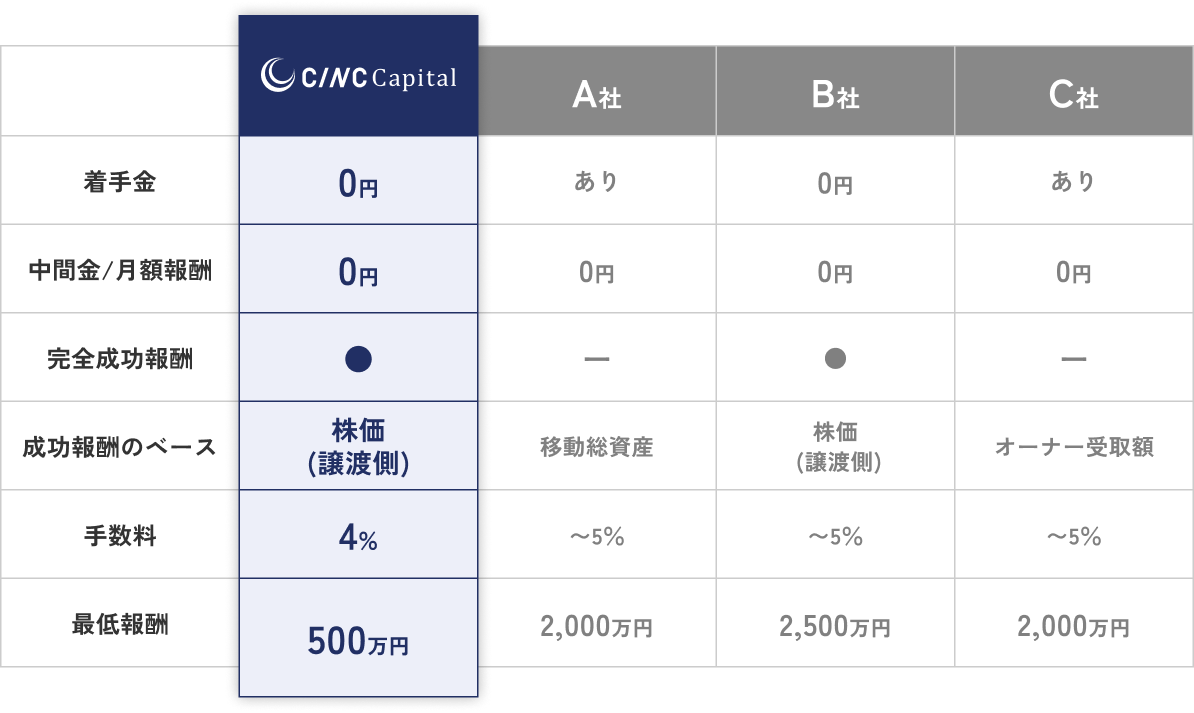 オーナー様の手残りを最大化するために、料金体系にこだわりました。最低報酬500万円、仲介手数料は一律手数料4%を採用し、通常の手数料率よりも下げて設定しております。譲渡企業様は完全成功報酬制で、ご成約まで費用は一切いただいておりません。